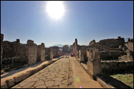 Ulička v Pompejích a v pozadí čnící Vesuv