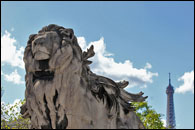 Paříž - majestátní pohled lva v pozadí s Eiffelovou věží