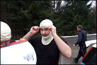 Na místo jsme museli dorazit přesně v 11.00 hodin dopoledne moravského času, protože testování se uskutečnilo v nové testovací Rally aréně u Slavičína, zhruba 30 km od Zlína. Po cestě v Otrokovicích jsem měl ještě schůzku s „Mickeyem“ z fóra eWRC, od kterého jsem měl koupit do své sbírky tři kousky modelů, jak jinak, než značky Ford. Bohužel se mi ho v nedělních dopoledních hodinách nepodařilo vzbudit, tak jsem náš kontrakt nechal na odpoledne, až se budeme vracet. Na pumpě jsme se osvěžili teplou čokoládou a vyrazili vyhledat Rally arénu. Můj (kamarády pomlouvaný) navigační přístroj MIO nás po zadání GPS pozice arény opravdu dovedl až k vrátnici, kde již čekalo několik aut. Po vystoupení z auta jsem u jednoho ze stojících vozů poznal Venu Dunovského a šel jsem se s ním konečně osobně seznámit. Po seznámení nám řekl, jak testování bude probíhat, a že musíme projet vrátnicí a ještě zavřenými dveřmi. Rally aréna se totiž nachází uvnitř vojenského prostoru. V jednom z aut jsem objevil mou známou, časoměřičku Lenku Zlámalovou s jejím přítelem. Protože bylo potřeba počet aut zredukovat (v místě testování nebylo místo na parkování), tak jsme je vzali do mého Fordu Focus C-MAX, protože my bychom se k nim do třídveřového Fiatu Bravo těžko dostávali. Poté jsme již vyrazili a po pár minutách jízdy dorazily k samotné Rally aréně. Zaparkovali jsme auto a mezitím již dorazila dodávka Sparrow Racing týmu a na přívěsu byl závodní Ignis. Během několika vteřin byl z káry dole a během dalších několika vteřin mu už chyběla všechna čtyři kola … Jasně, nikdo je nezcizil, ale zřejmě příprava mechaniků na výběr vhodného obutí na testovací trať. Vena se svým spolujezdcem si jeli napsat trať (byli zde také poprvé) a my jsme okoukli závodní auto a pořídili pár fotek. S obavami jsem nakoukl do Ignise, jak má širokou sedačku na pozici spolujezdce, jestli se do ní vůbec vejdu a nejel jsem 400 km zbytečně. Oddechl jsem si, protože sedačka byla opravdu pro normální lidi. Po navrácení Veny a sdělení mi, kdy pojedu, jsem se ani nechtěl jít podívat na trať, abych svezení nepropásl, ale nakonec jsem se zbytkem lidí vyrazil do nedalekého vracáku. Vydržel jsem tam jednu testovací rundu a už jsem se pro jistotu zase hrnul zpátky, abych to opravdu nepromeškal. Konečně na mě vychází řada a jdu hledat zapůjčenou nehořlavou kuklu (no jako bych nevěděl, kde jí mám). Oblékl jsem si jí na hlavu a čekal, až se Ignis s Venou vrátí a od předchozího šťastného si zapůjčím helmu.